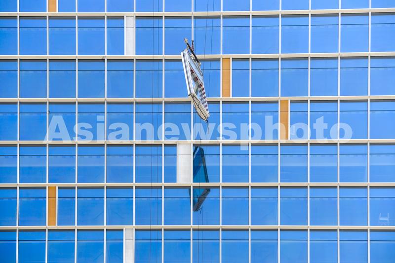 图片说明:工人们正在200米的高空安装玻璃幕墙