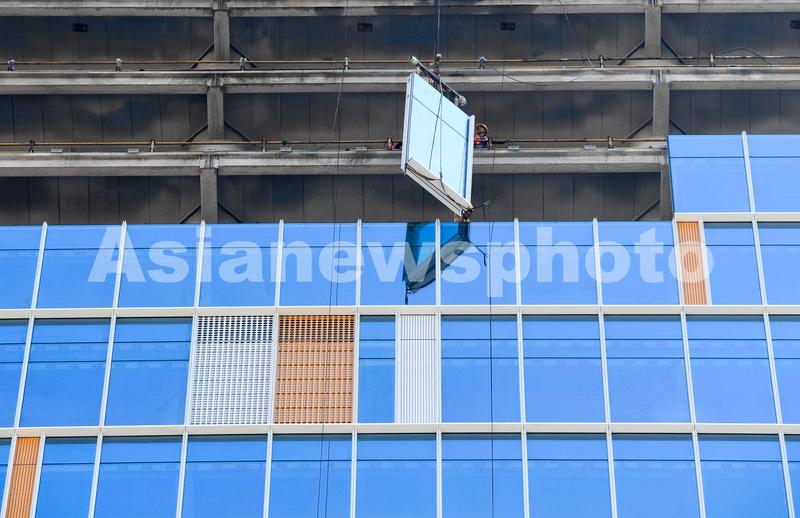 图片说明:工人们正在200米的高空安装玻璃幕墙