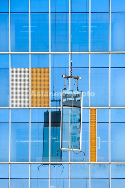 图片说明:工人们正在200米的高空安装玻璃幕墙