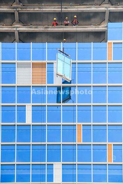 图片说明:工人们正在200米的高空安装玻璃幕墙
