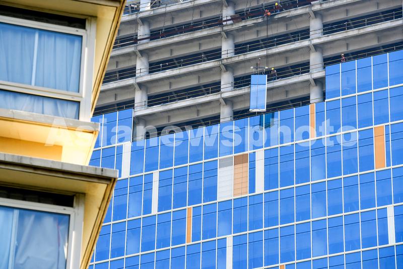 图片说明:工人们正在200米的高空安装玻璃幕墙