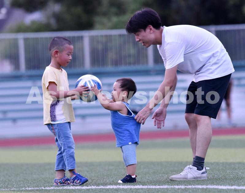 2021年8月31日傍晚,在安徽省巢湖市体育场内,两名小朋友在家人的陪伴下玩足球。