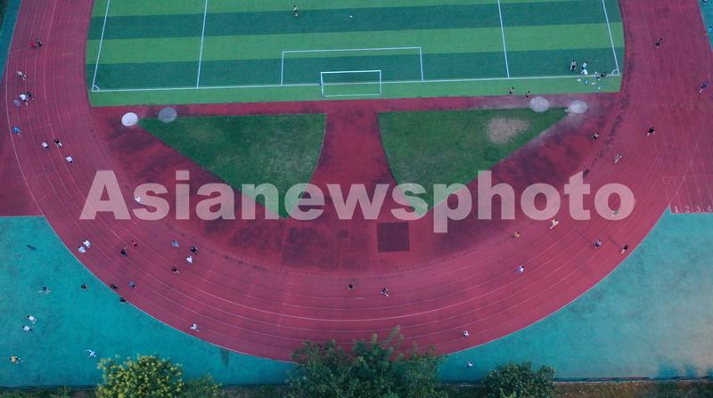 2021年8月31日傍晚,市民在安徽省巢湖市体育场内进行体育锻炼。