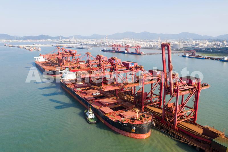 图片说明:2021年9月1日,浙江省宁波舟山港北仑港区矿石码头铁矿石接卸一派繁忙。