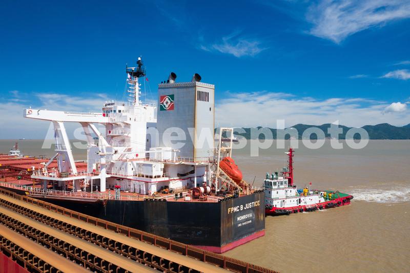 图片说明:2021年8月30日,装载着18.5万吨铁矿石的“台塑正辉”轮正在靠泊浙江省宁波舟山港北仑港区矿石码头。