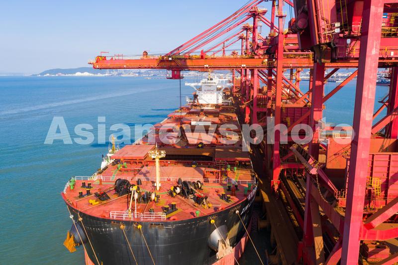 图片说明:2021年9月1日,装载着8.8万吨铁矿石的“新丽海”轮在浙江省宁波舟山港北仑港区矿石码头进行接卸作业。