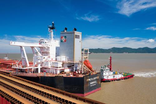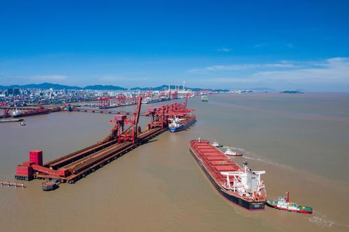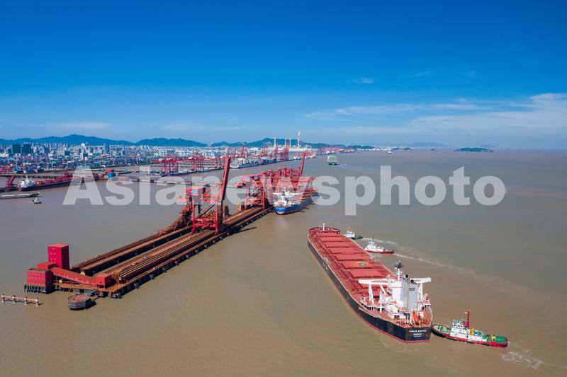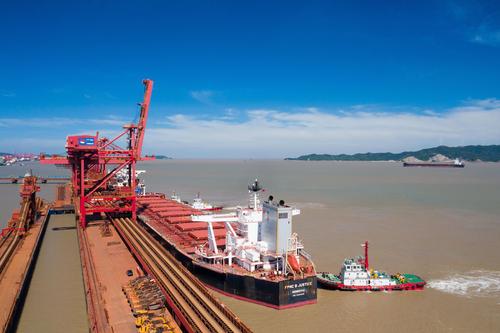 图片说明:2021年8月30日,装载着18.5万吨铁矿石的“台塑正辉”轮在3艘拖轮的助力下,徐徐靠泊浙江省宁波舟山港北仑港区矿石码头。