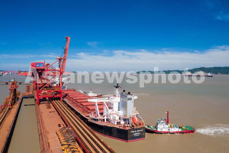 图片说明:2021年8月30日,装载着18.5万吨铁矿石的“台塑正辉”轮正在靠泊浙江省宁波舟山港北仑港区矿石码头。