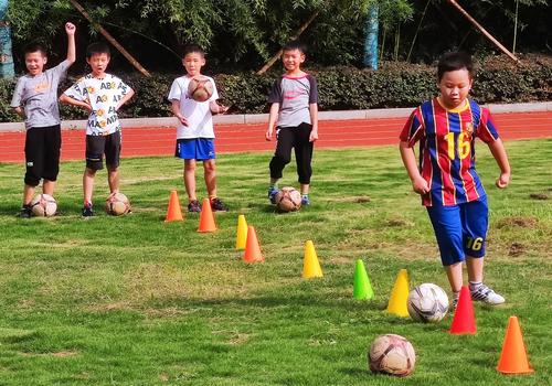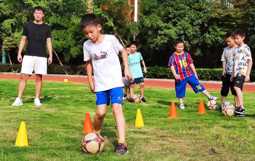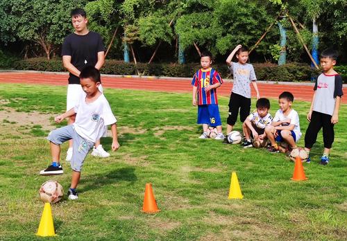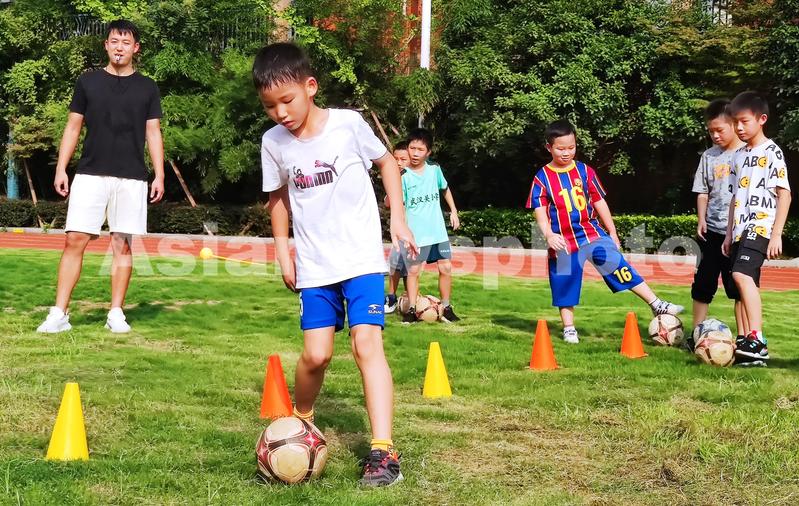 图片说明:9月2日,武汉市江汉区武汉关小学,小学生们在课后托管班上,跟着体育老师周宇琛(左)学踢足球。