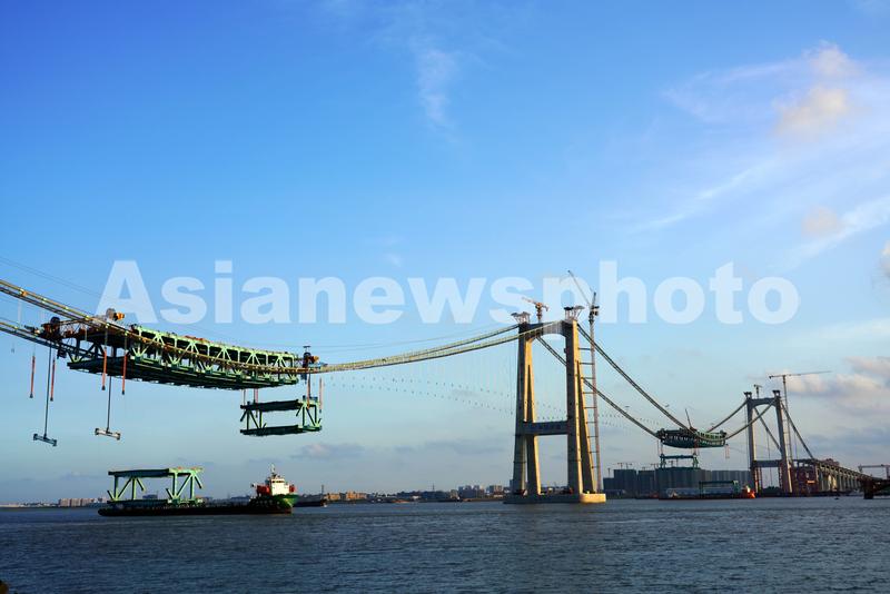 2021年9月4日,浙江省温州市瓯江北口大桥正在吊装加劲梁。近日,浙江省温州市瓯江北口大桥加速推进项目建设,抓紧吊装加劲梁。瓯江北口大桥连接乐清市黄华与温州灵昆岛,全长约有7.9公里的桥梁工程,其中跨瓯江主桥长2090米,是宁波至东莞国家高速公路和国道G228线两大项目共线跨越瓯江的控制性工程,是世界首座三塔四跨双层钢桁梁悬索桥,预计今年底可建成,大桥的建设对于提高东部沿海公路运输大通道通行能力、缓解甬台温高速压力具有重要意义。