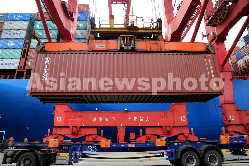 图片说明:2021年9月4日,大型岸桥在江苏连云港港集装箱码头往货轮上吊装集装箱。