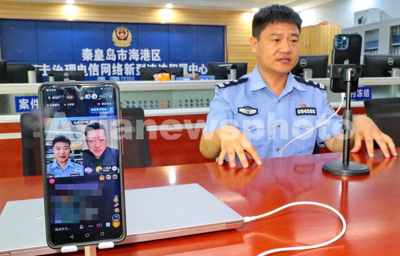 2021年9月5日,河北省秦皇岛市公安局海港分局反诈民警陈国平在直播中进行互动交流。