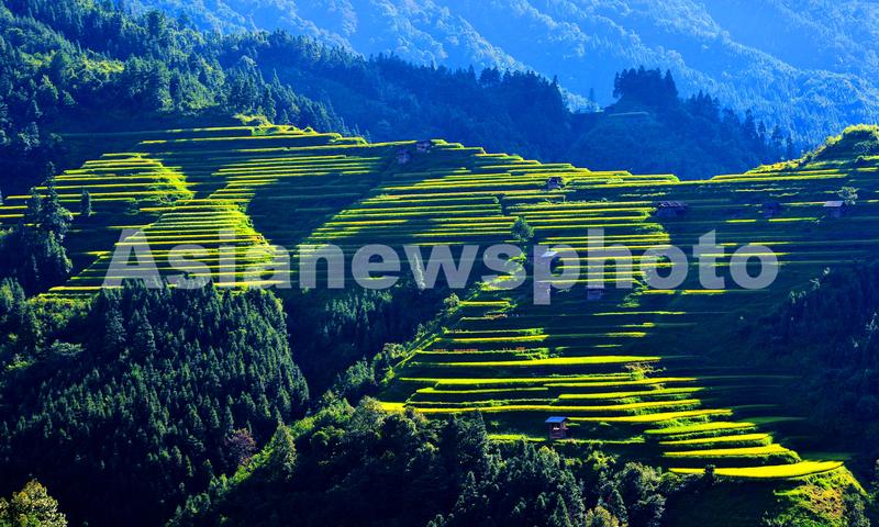 图片说明:2021年9月3日,在贵州省黔东南苗族侗族自治州从江县加榜乡平引加车村拍摄的梯田风光。