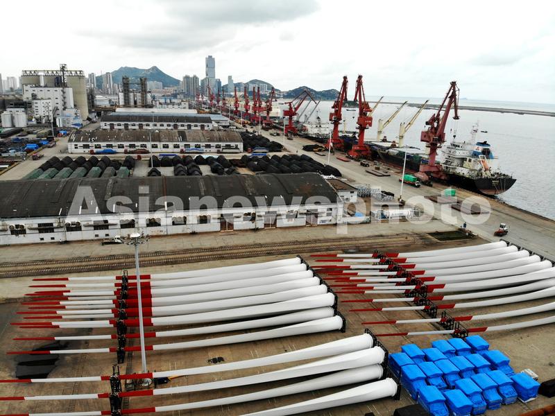 图片说明:2021年9月4日,数艘远洋洋装轮在江苏连云港港东方公司码头装卸货物(无人机照片)。