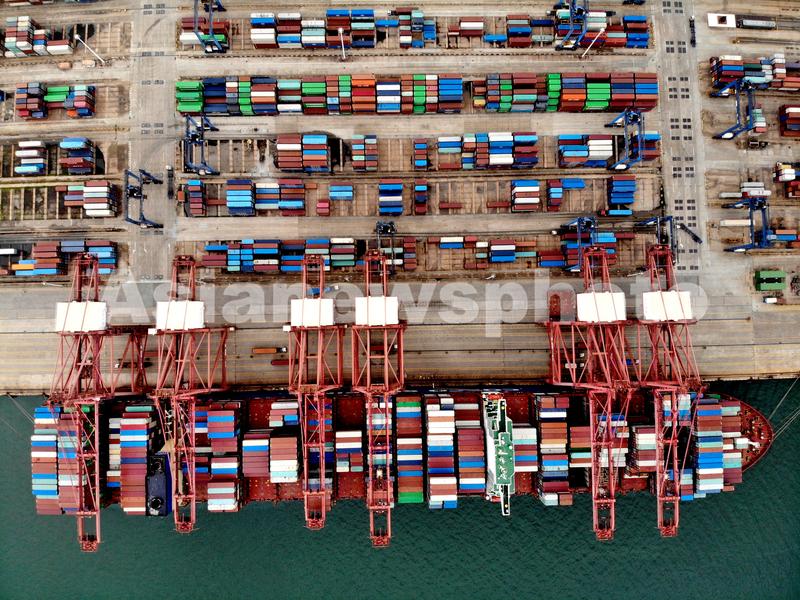 图片说明:2021年9月4日,一艘远洋运输轮在江苏连云港港集装箱码头装载集装箱(无人机照片)。