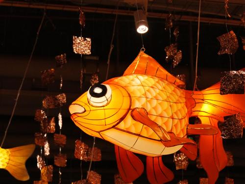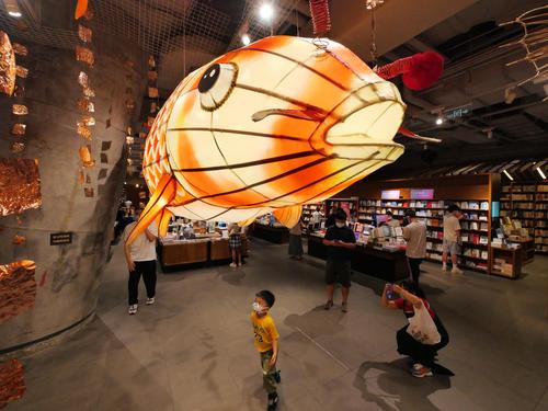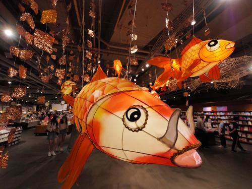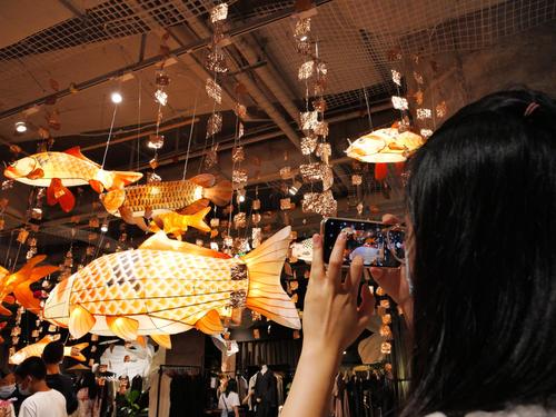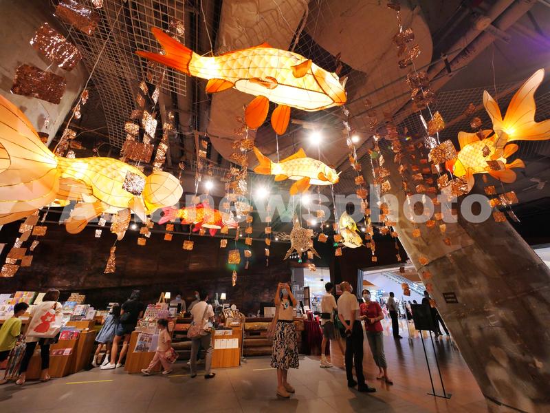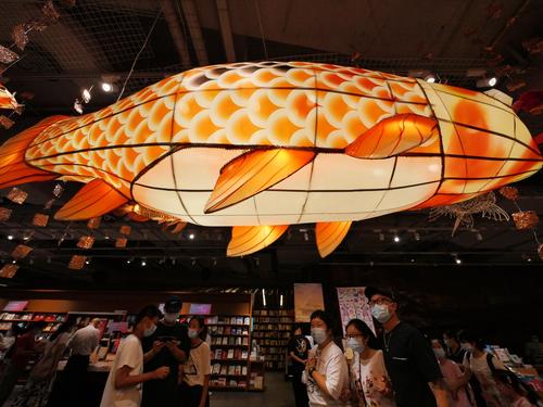 2021年9月11日,广东广州,2021年尚天河文化季精品活动“鱼龙舞”非遗作品展,本次展览的作品采用佛山传统扎作工艺制作而成,加上传统彩灯艺术,其中的竹篾鱼更是以纯骨架形式展示,非常有穿透力。