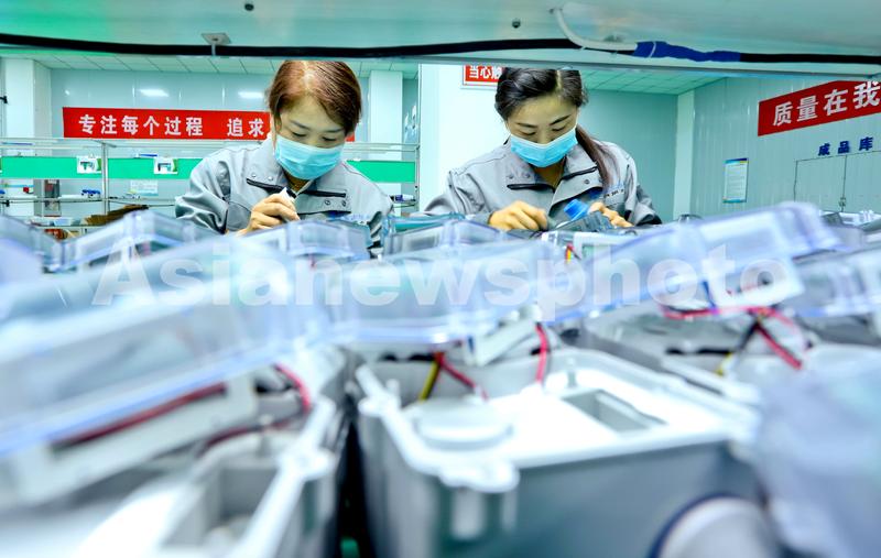 2021年9月15日,甘肃张掖智能产业园中云科技蓝牙耳机生产车间内,工人在生产线上忙碌。