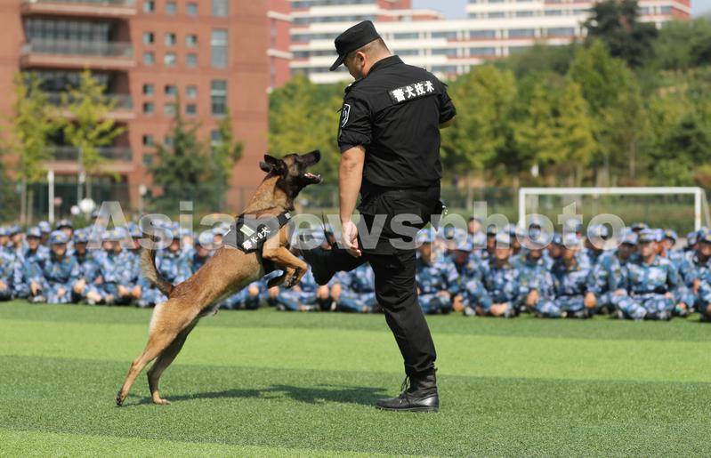 9月14日,青岛市公安局地铁分局刑警大队警犬工作站的训导员向大一新生展示警犬如何跳跃障碍。