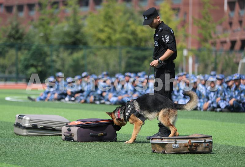 9月14日,青岛市公安局地铁分局刑警大队警犬工作站的训导员向大一新生演示警犬如何搜索危险品。