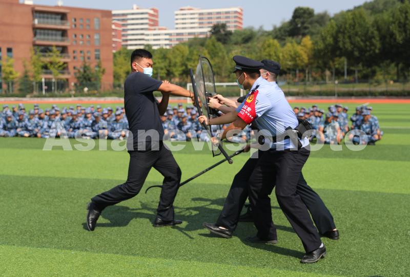 9月14日,青岛市公安局地铁分局灵山卫站派出所的民警向大一新生演示控制抓捕犯罪嫌疑人的技战术。
