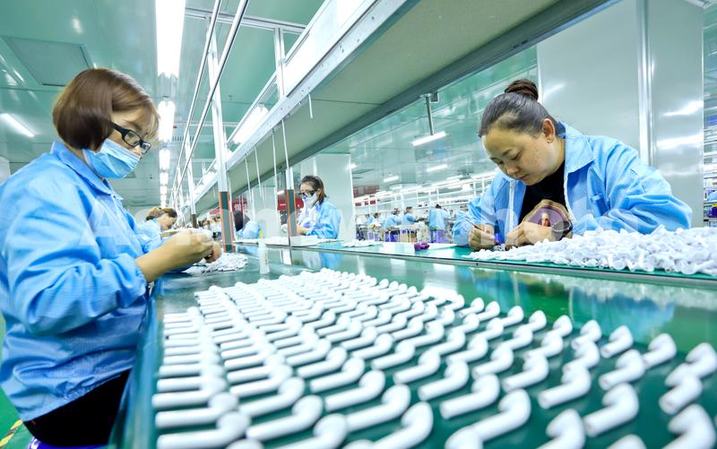 2021年9月15日,甘肃张掖智能产业园中云科技蓝牙耳机生产车间内,工人在生产线上忙碌。