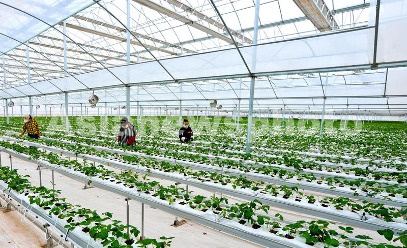 2021年9月15日,甘肃省张掖市甘州区靖安乡现代高效农业产业示范园内,工作人员正在高效日光智能温室内精心养护草莓苗。