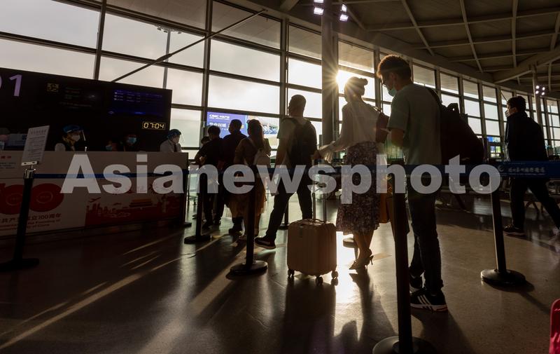 9月16日,扬州泰州国际机场复航后首个离港航班的旅客。
