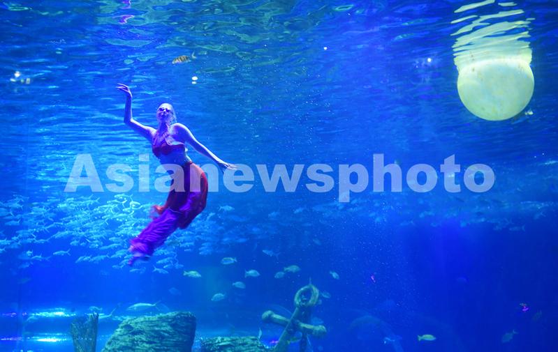 2021年9月19日,安徽省阜阳尧泰汉海海洋公园内的水下芭蕾“嫦娥奔月”表演吸引众多游客观看。
