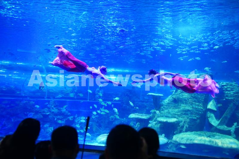 2021年9月19日,安徽省阜阳尧泰汉海海洋公园内的水下芭蕾“嫦娥奔月”表演吸引众多游客观看。