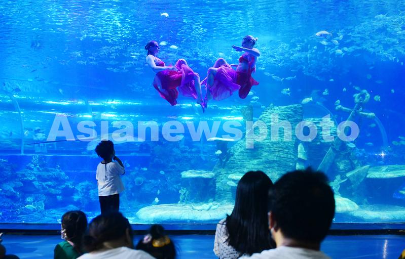2021年9月19日,安徽省阜阳尧泰汉海海洋公园内的水下芭蕾“嫦娥奔月”表演吸引众多游客观看。