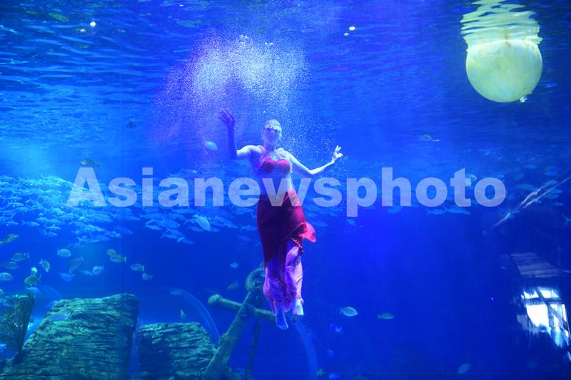 2021年9月19日,安徽省阜阳尧泰汉海海洋公园内的水下芭蕾“嫦娥奔月”表演吸引众多游客观看。