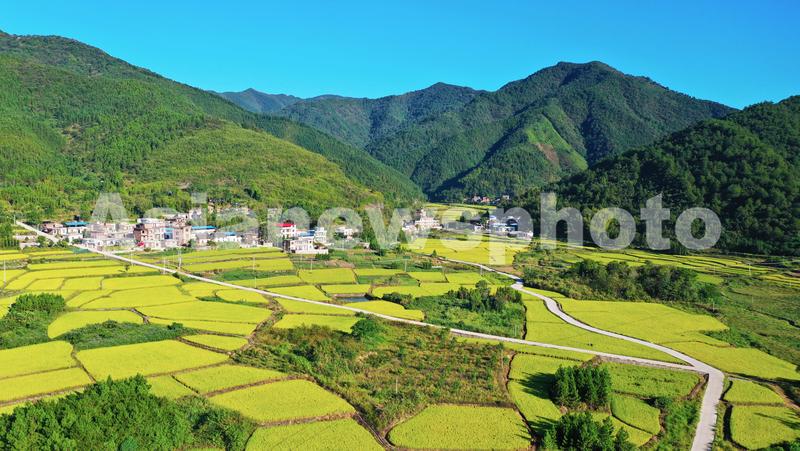 图片说明:2021年9月24日,湖南省永州市新田县骥村镇肥源村,青山环抱中,金黄的稻田与山村民居相互映衬。