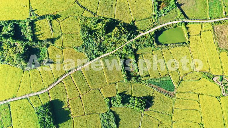图片说明:2021年9月24日,湖南省永州市新田县骥村镇肥源村,青山环抱中,金黄的稻田与山村民居相互映衬。