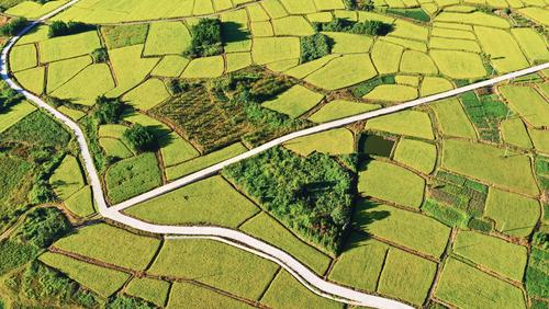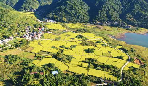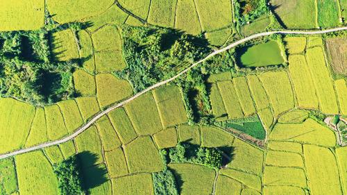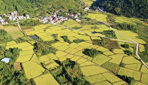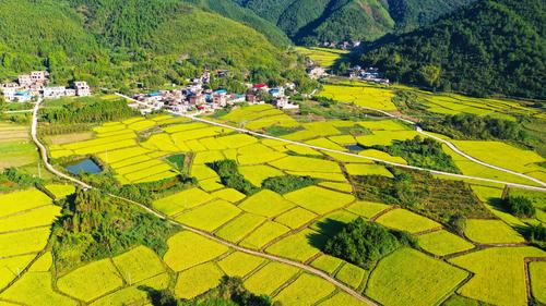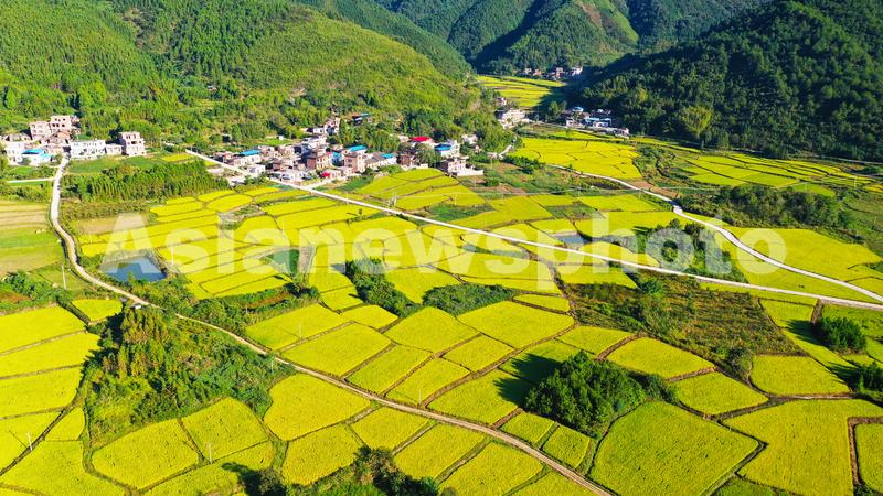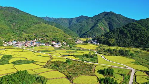 图片说明:2021年9月24日,湖南省永州市新田县骥村镇肥源村,青山环抱中,金黄的稻田与山村民居相互映衬。