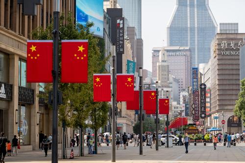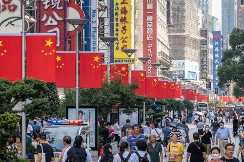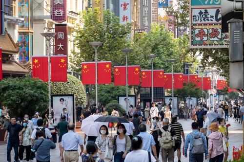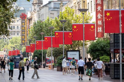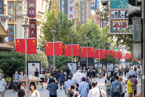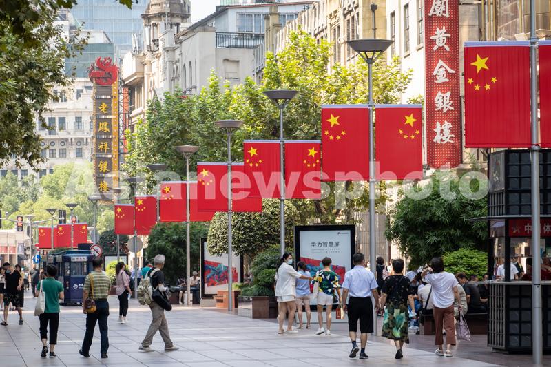 图片说明:2021年9月29日,上海,南京路步行街道路中央挂起了连片的五星红旗,迎接即将到来的国庆节。