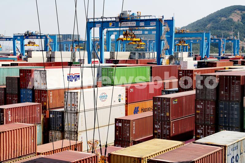 图片说明:9月29日,位于山东自贸区青岛片区的山东港口青岛港全自动化码头,高速轨道吊在集装箱堆场上往来穿梭。