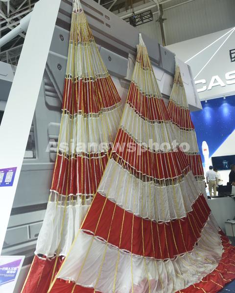 图片说明:2021年9月29日,在珠海举办的中国航展上拍摄到的新一代载人飞船试验船返回舱降落伞。