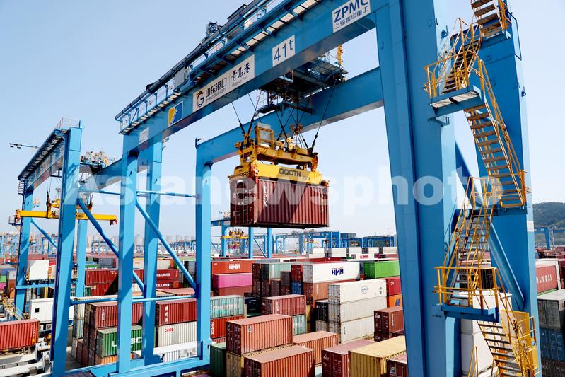 图片说明:9月29日,位于山东自贸区青岛片区的山东港口青岛港全自动化码头,高速轨道吊在集装箱堆场上往来穿梭。