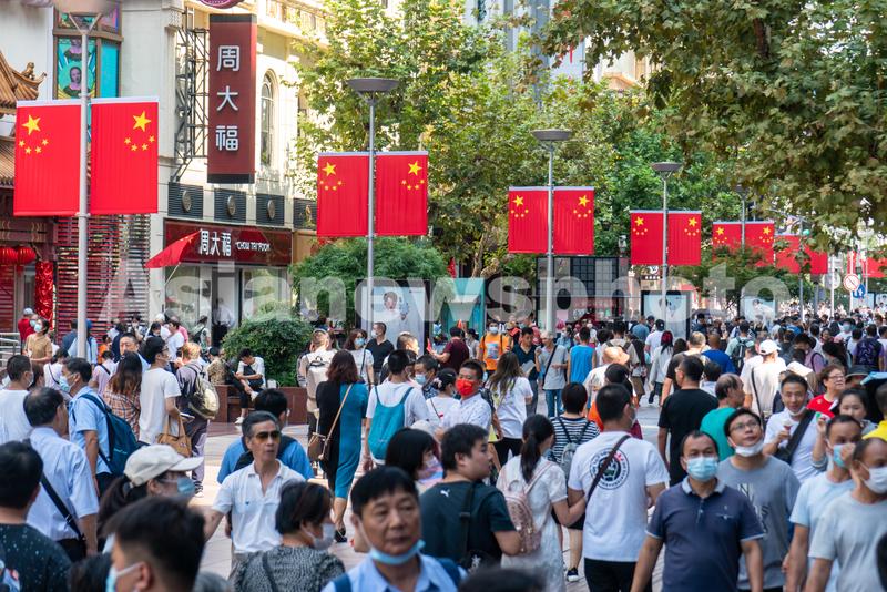 图片说明:2021年10月1日,上海,国庆节上午,外滩和南京路步行街附近游客熙熙攘攘,人流相当密集。