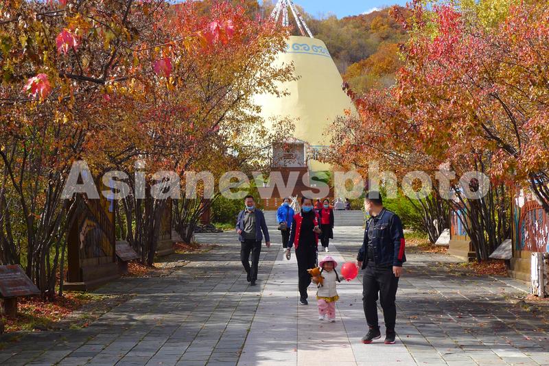 图片说明:2021年10月1日,游客在黑河市中俄民族风情园游览。