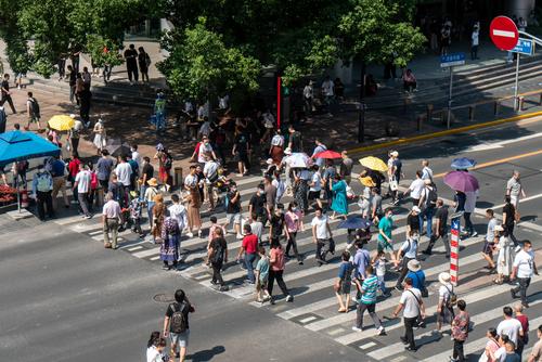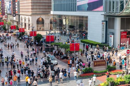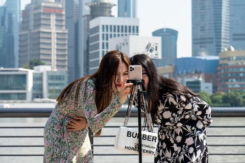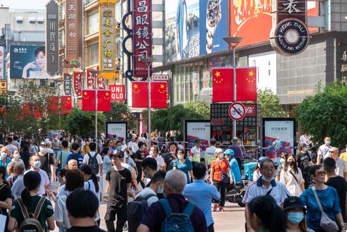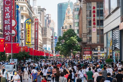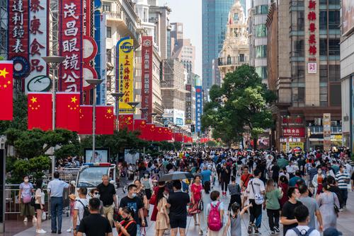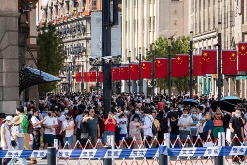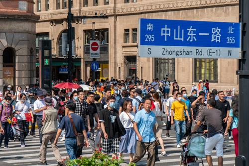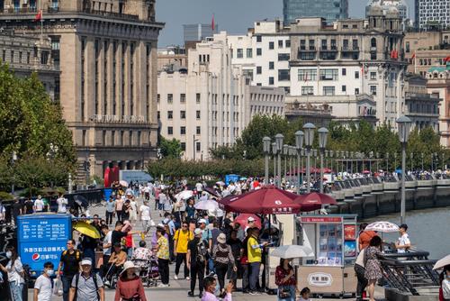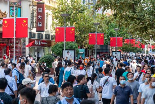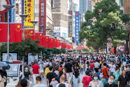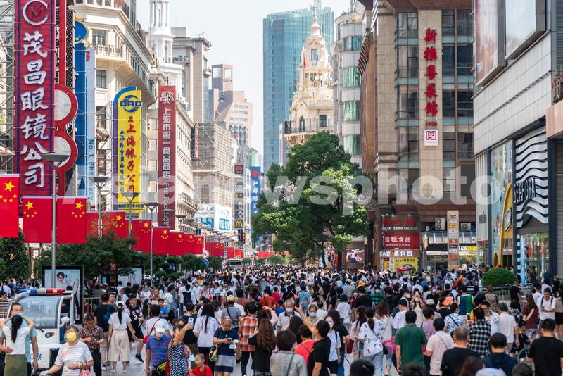 图片说明:2021年10月1日,上海,国庆节上午,外滩和南京路步行街附近游客熙熙攘攘,人流相当密集。
