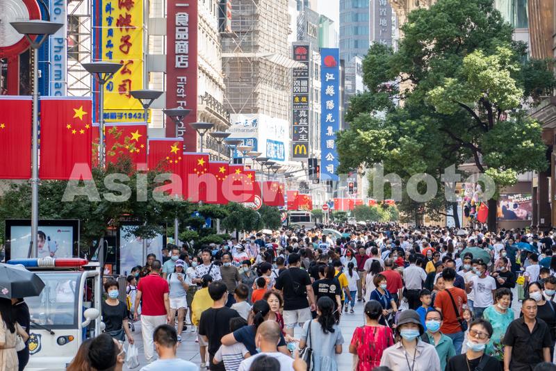 图片说明:2021年10月1日,上海,国庆节上午,外滩和南京路步行街附近游客熙熙攘攘,人流相当密集。