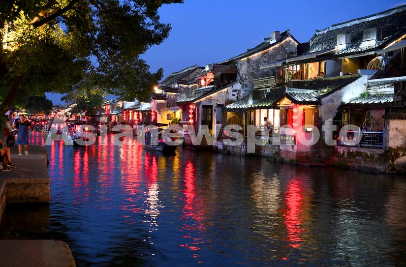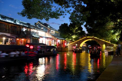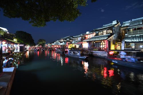 2021年10月2日,国庆长假第二天,浆声灯影下的浙江省嘉兴市水乡古镇西塘美轮美奂,游人如织。来自各地的游客尽情享受长假休闲游玩乐趣。