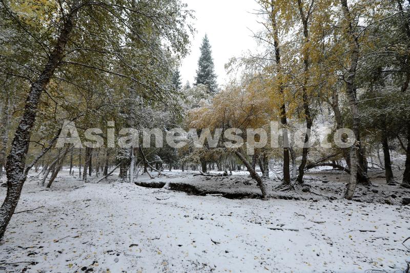 2021年10月6日,新疆博尔塔拉蒙古自治州境内的国家森林公园哈日图热格迎来了一场雪。