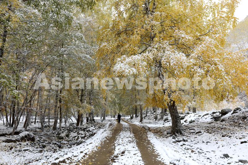 2021年10月6日,新疆博尔塔拉蒙古自治州境内的国家森林公园哈日图热格迎来了一场雪。