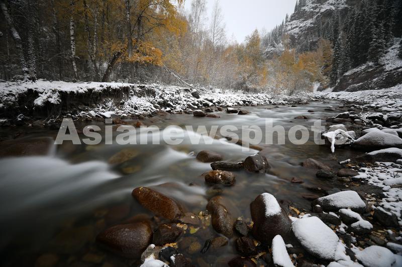 2021年10月6日,新疆博尔塔拉蒙古自治州境内的国家森林公园哈日图热格迎来了一场雪。