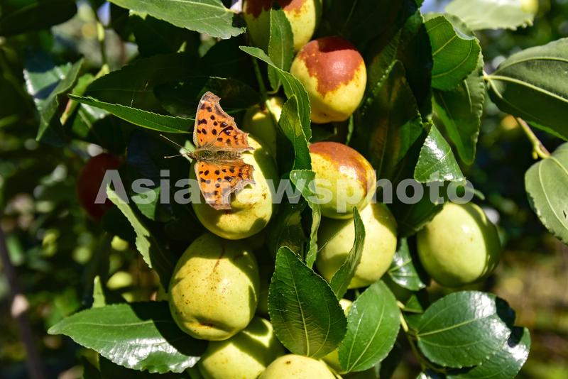 图片说明:2021年10月11日,一只蝴蝶落在山东省青州市黄楼街道大贯店村一处果园成熟的梨枣上。
