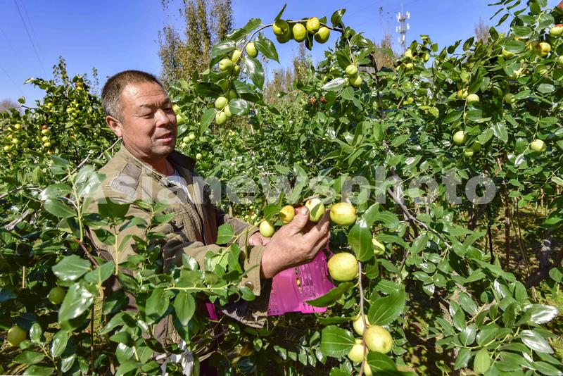 图片说明:2021年10月11日,山东省青州市黄楼街道大贯店村农民李国平在采摘梨枣。