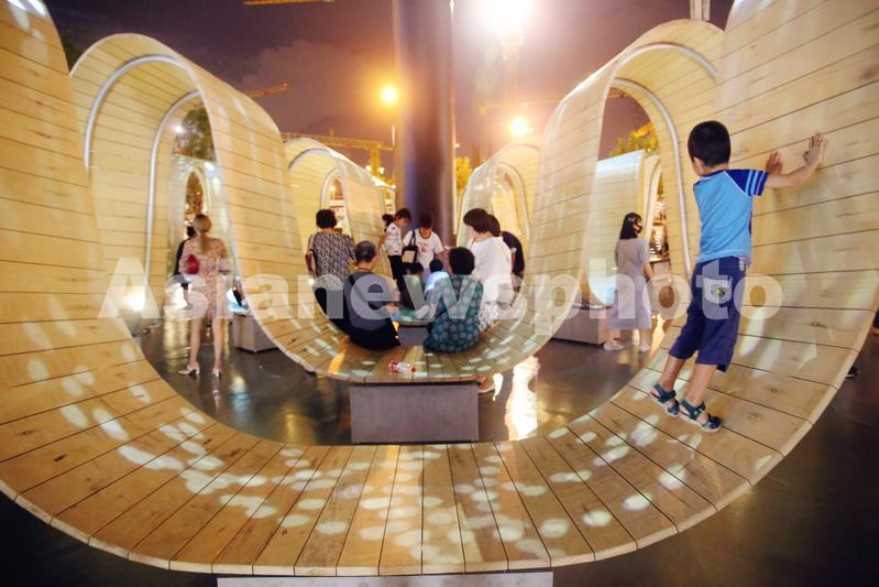 图片说明:2021年10月10日,上海,浦东文化旅游新地标前滩太古里吸引了众多游客休闲娱乐、购物消费,夜景灯光秀与创意艺术装置巧妙结合。
