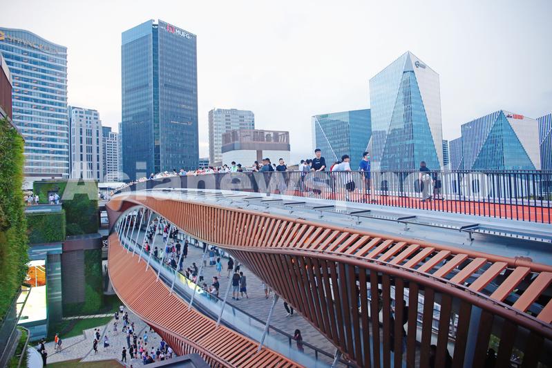 图片说明:2021年10月10日,上海,浦东文化旅游消费新地标前滩太古里商业中心的首个“双层开放空间”屋顶天空环道成为申城网红景观。
